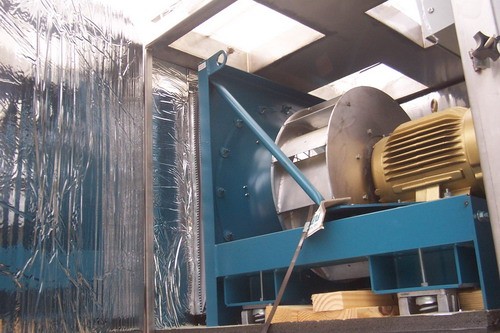 Air Movement Components: The LAF hoods are equipped with Twin City Fan, Model 221 fans to provide air movement. The fans are direct drive with a 22-3/4" dia. forward curved style Aluminum Airfoil wheel. The fan is constructed of painted carbon steel and is sized to deliver a uniform velocity of 150 FPM with a capacity for an additional 1.0" water gauge pressure drop due to filter loading. The fan is statically and dynamically balanced. The fan assembly is mounted on 1" deflection springs. The fan outlet is sealed to the plenum utilizing a flexible boot to help isolate vibrations. Motors are Baldor EM 3770T 7.5HP, 1800 RPM, 9.5 FLA, 460V, 3 Ph., 1.15 S.F. insulation Class F, TEFC, with T-Stats embedded in windings.